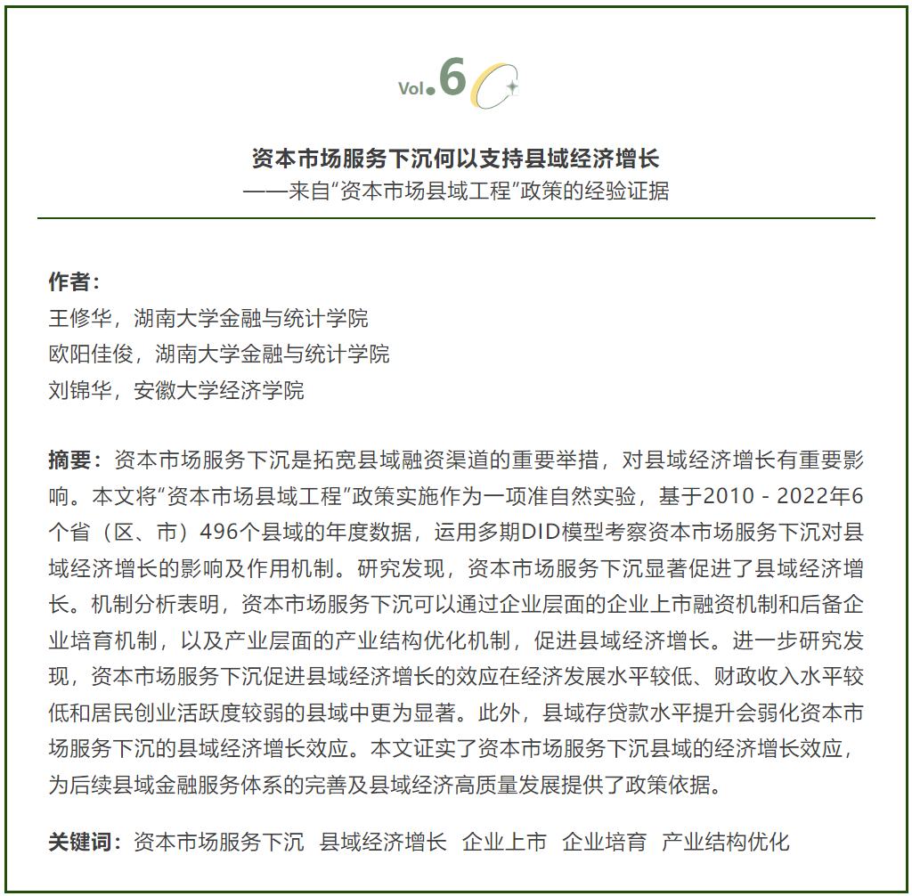 近日,情趣内衣 应用金融系王修华教授,和2022级博士研究生欧阳佳俊、安徽大学经济学院刘锦华老师(原情趣内衣 2020级博士研究生)合作的题为“资本市场服务下沉何以支持县域经济增长——来自“资本市场县域工程”政策的经验证据”的论文发表在《中国农村经济》2025年第6期。