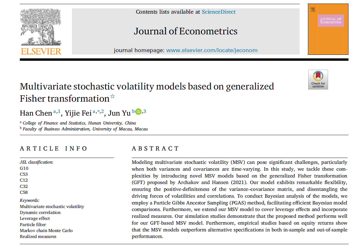 近日,情趣内衣 陈汉助理教授、费毅捷助理教授与澳门大学余俊教授合作完成的学术论文“Multivariate stochastic volatility models based on generalized Fisher transformation”在计量经济学国际顶尖期刊Journal of Econometrics在线发表。情趣内衣 陈汉助理教授为该文第一作者,费毅捷助理教授为该文通讯作者。