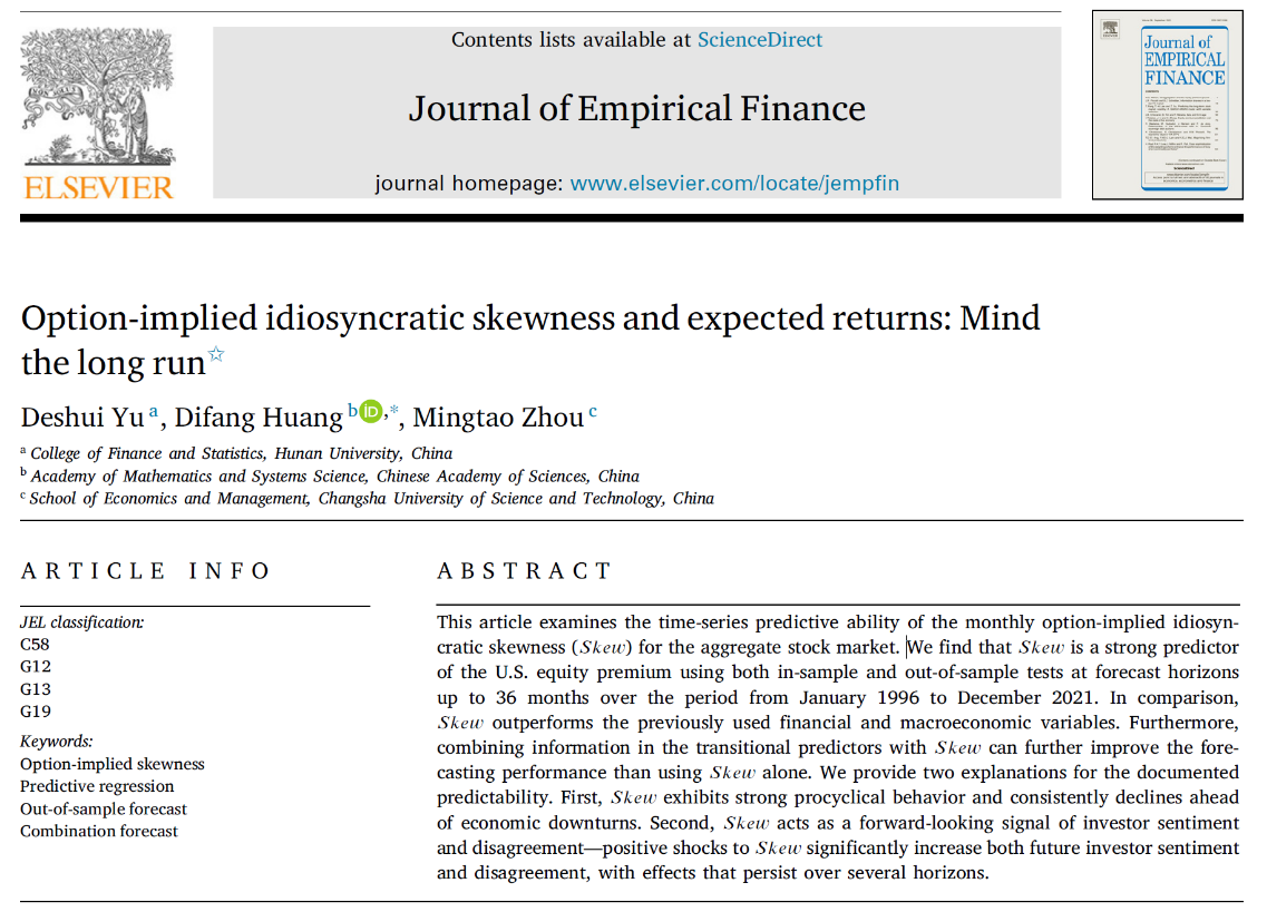近日,情趣内衣 金融科技与工程系余得水副教授的论文“Option-implied idiosyncratic skewness and expected returns: Mind the long run”在院定A2类期刊Journal of Empirical Finance,volume 83,September2025发表。
